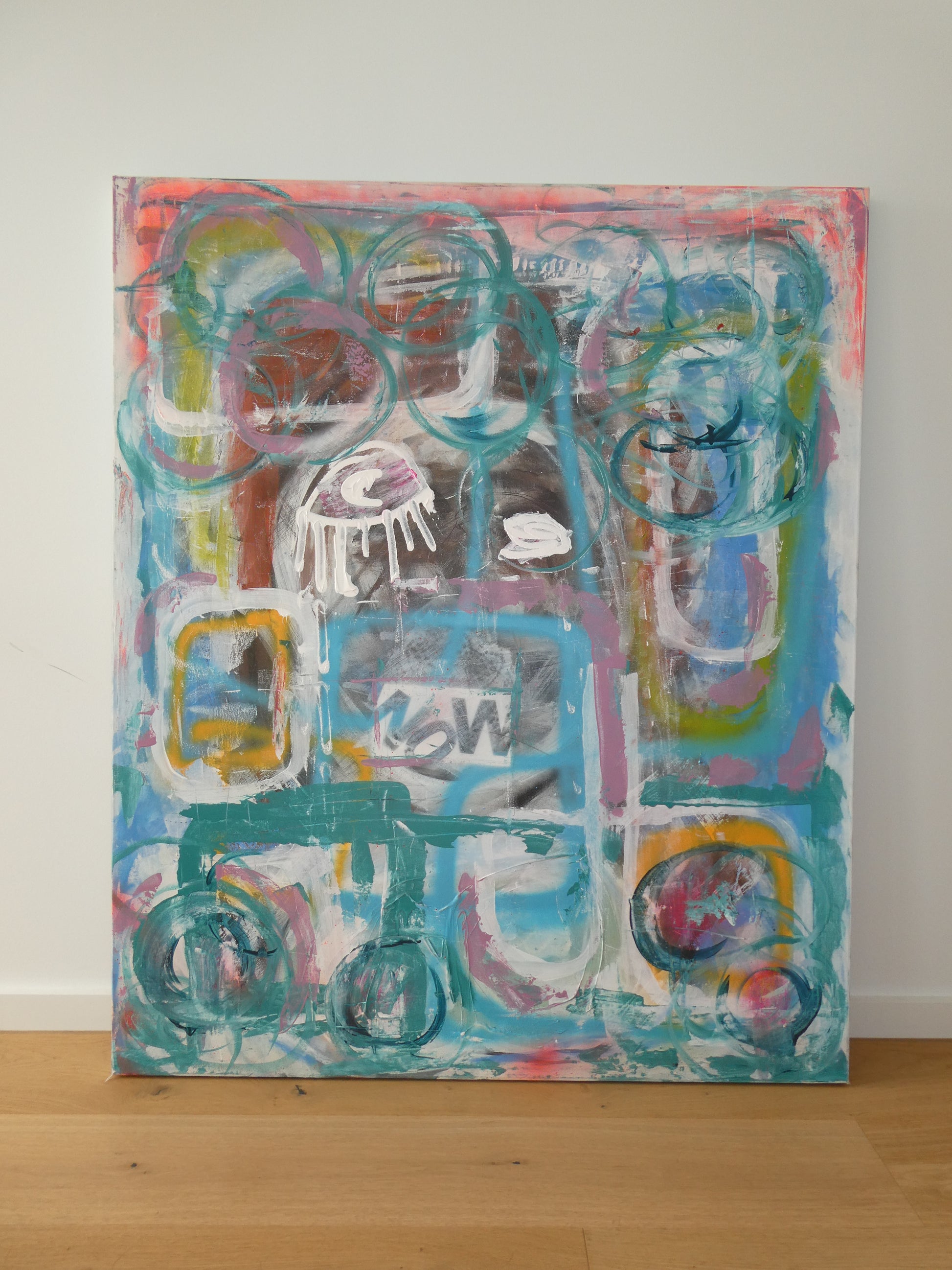 Acrylic, oil stick and spray paint on canvas